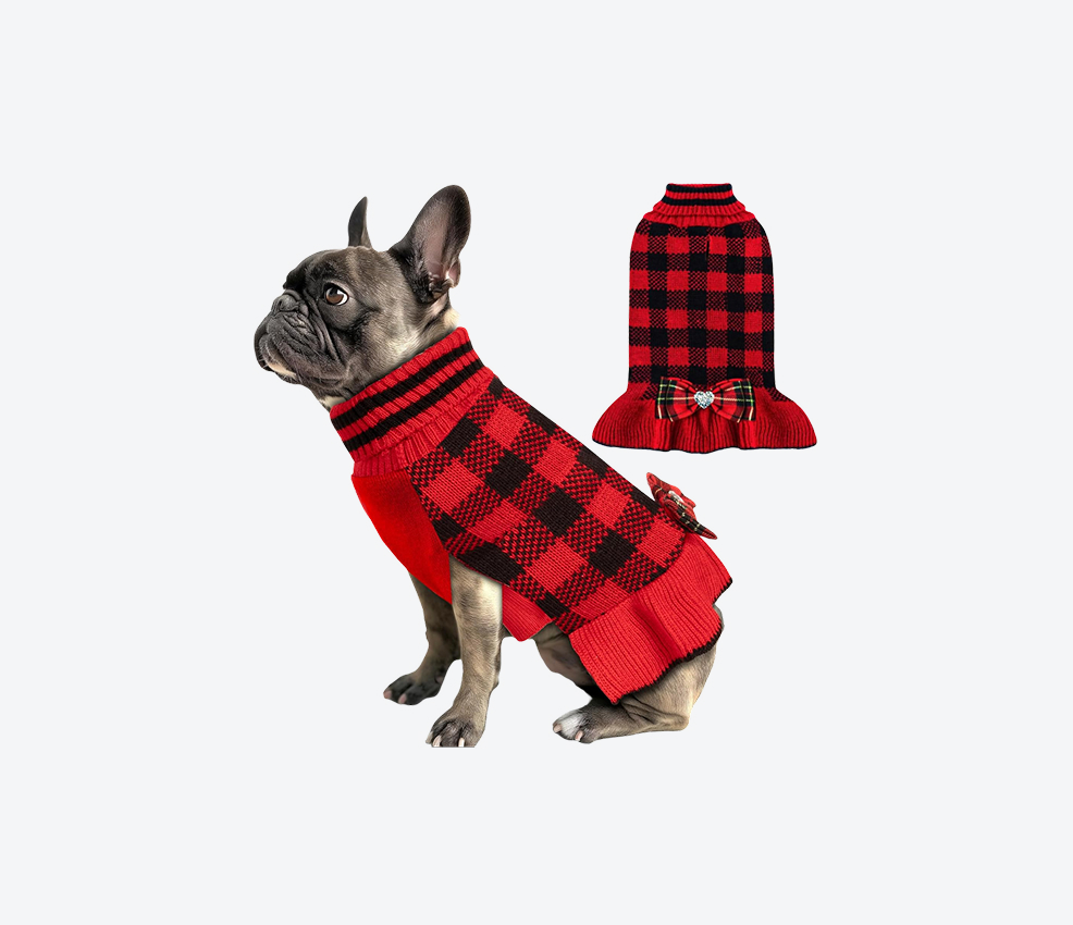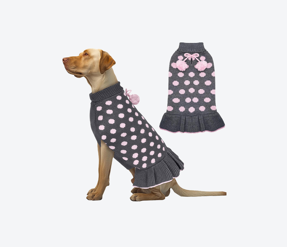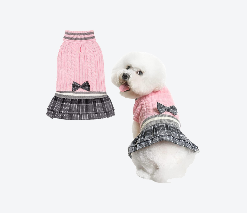 Despite being a dress-style sweater, it’s surprisingly practical. Reviews praise its comfortable stretch and breathable knit, making it great for indoor and light outdoor use. Small to medium dogs especially look adorable in this. If your dog enjoys attention (or if you enjoy taking pictures), this one’s a winner.