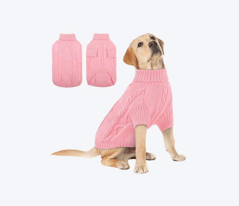 | Thick cable-knit design for added warmth Turtleneck offers great cold protection | May shed slightly during first washes Not ideal for very active dogs |